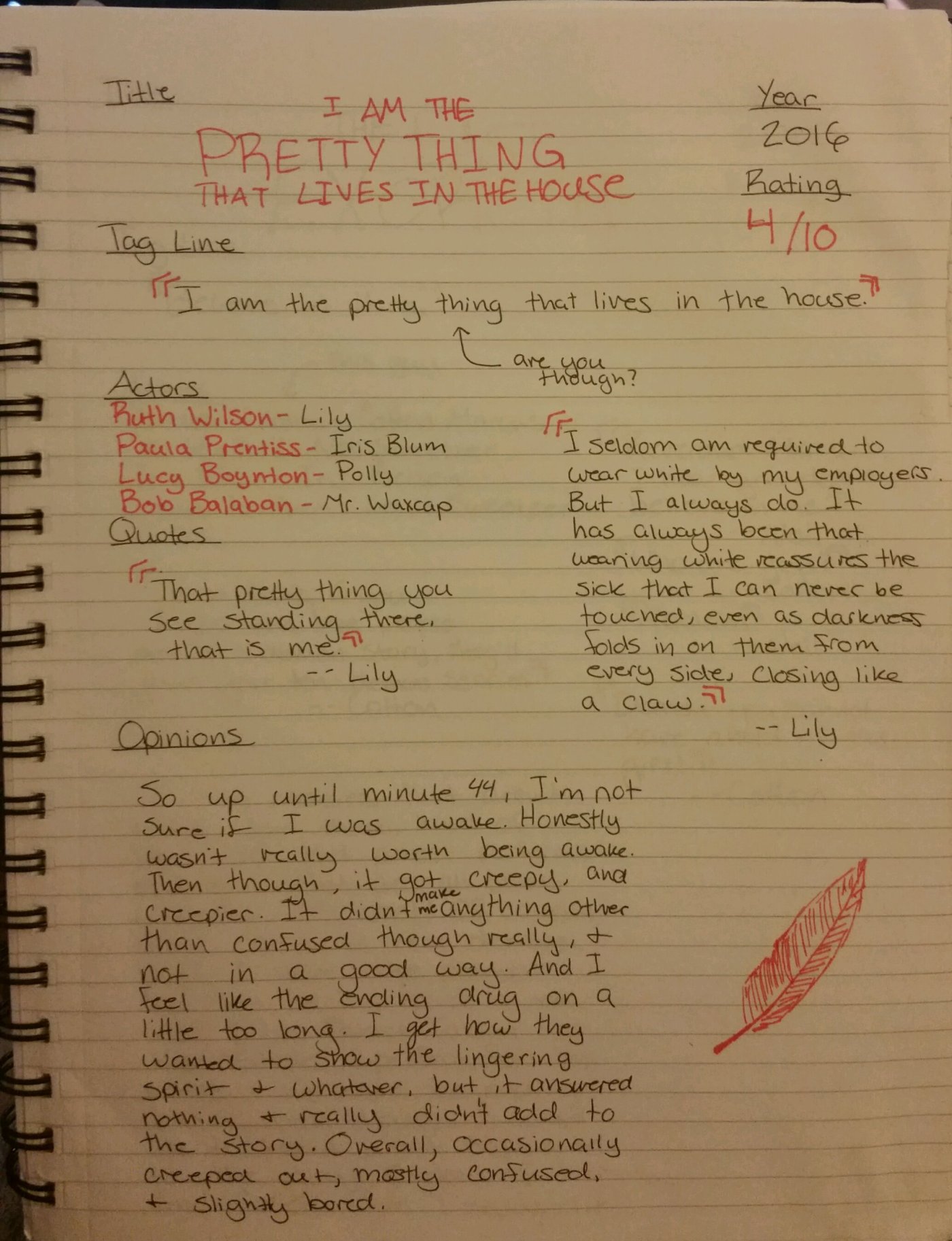 2 thoughts on “I Am the Pretty Thing That Loves In the House (2016)